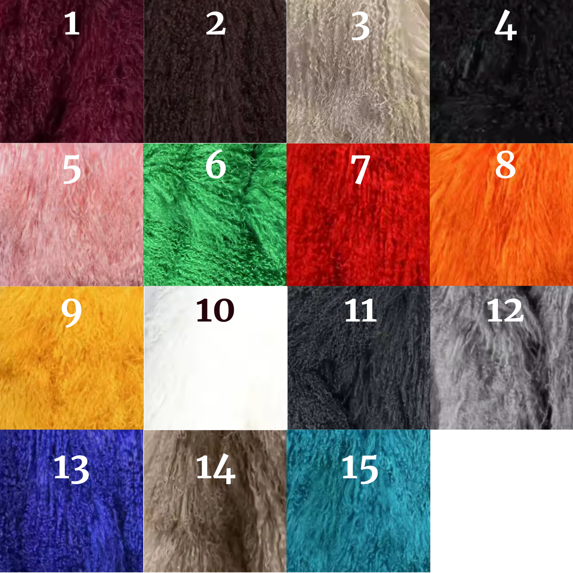This Mongolian fur, waist-length coat is a luxurious, show-stopping coat crafted from soft, fluffy, and textured Mongolian lambswool. The coat features a voluminous, curly fur exterior that provides warmth and a striking visual appeal. Its waist-length cut offers a stylish and versatile silhouette, suitable for layering over various outfits.