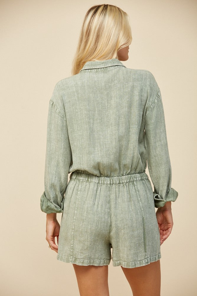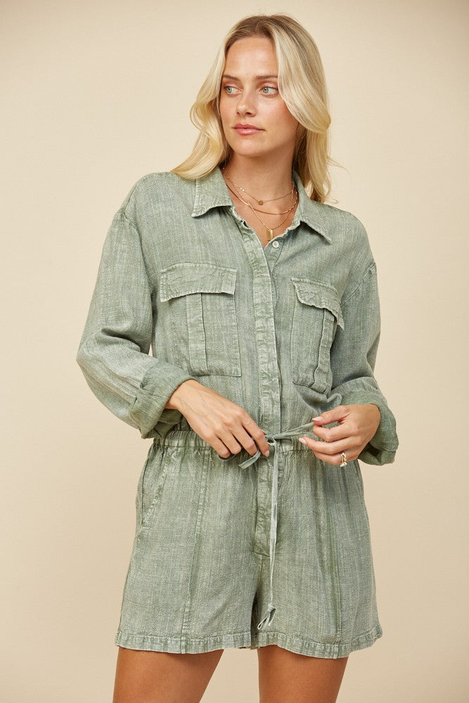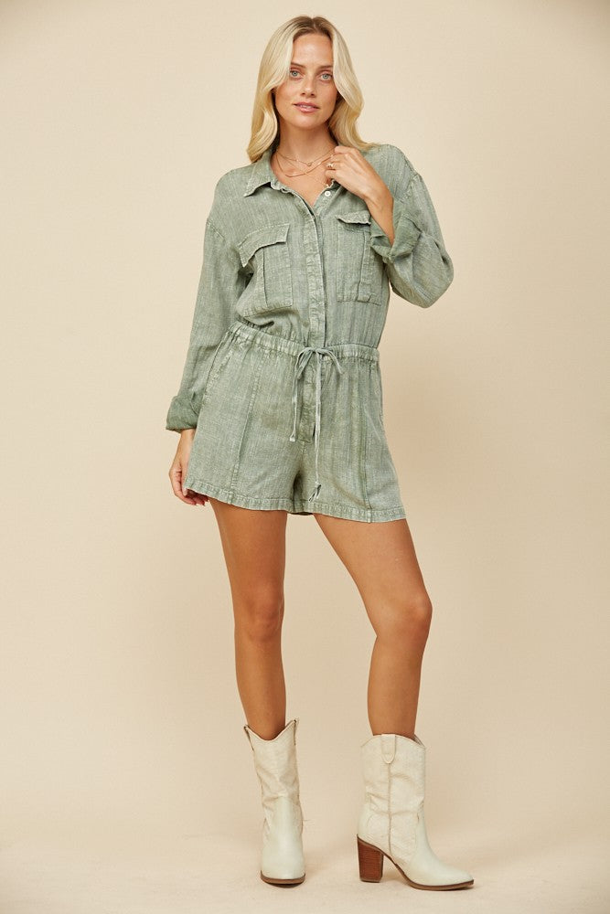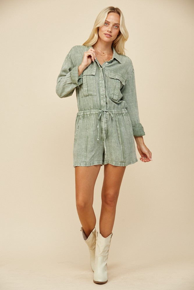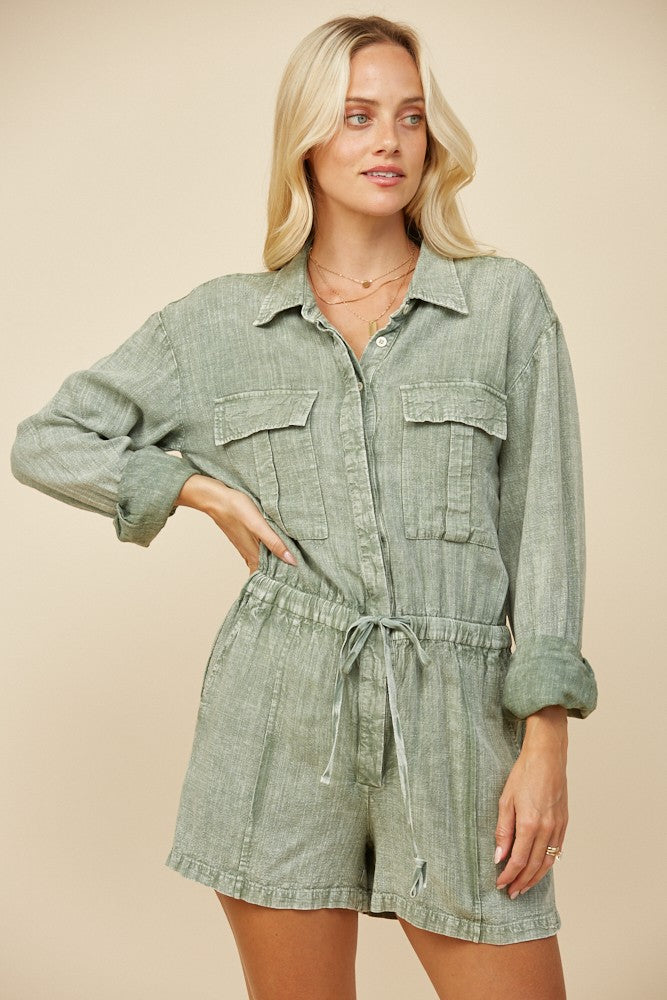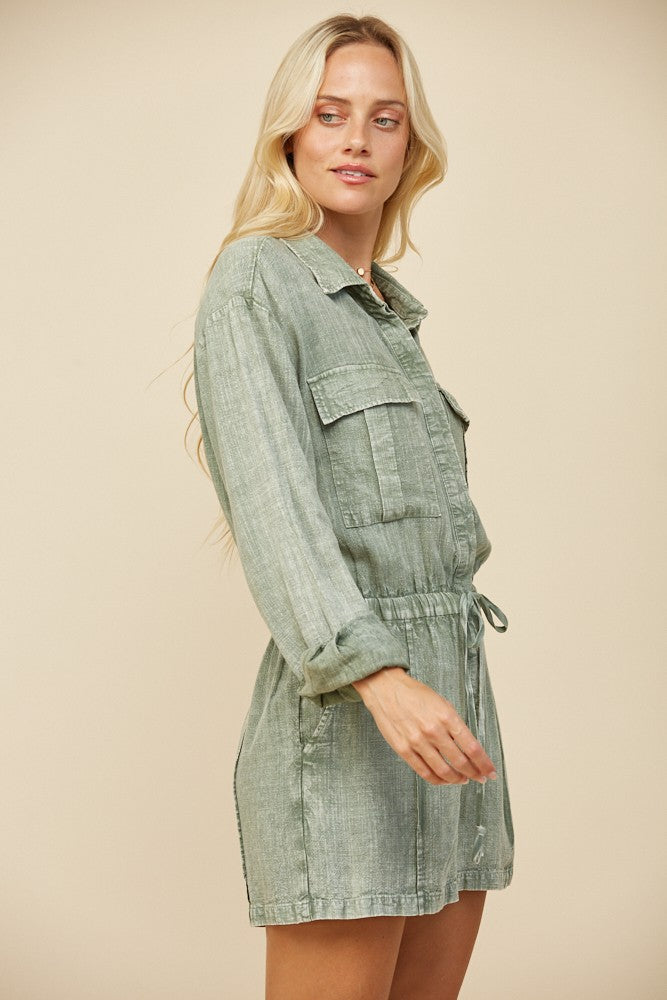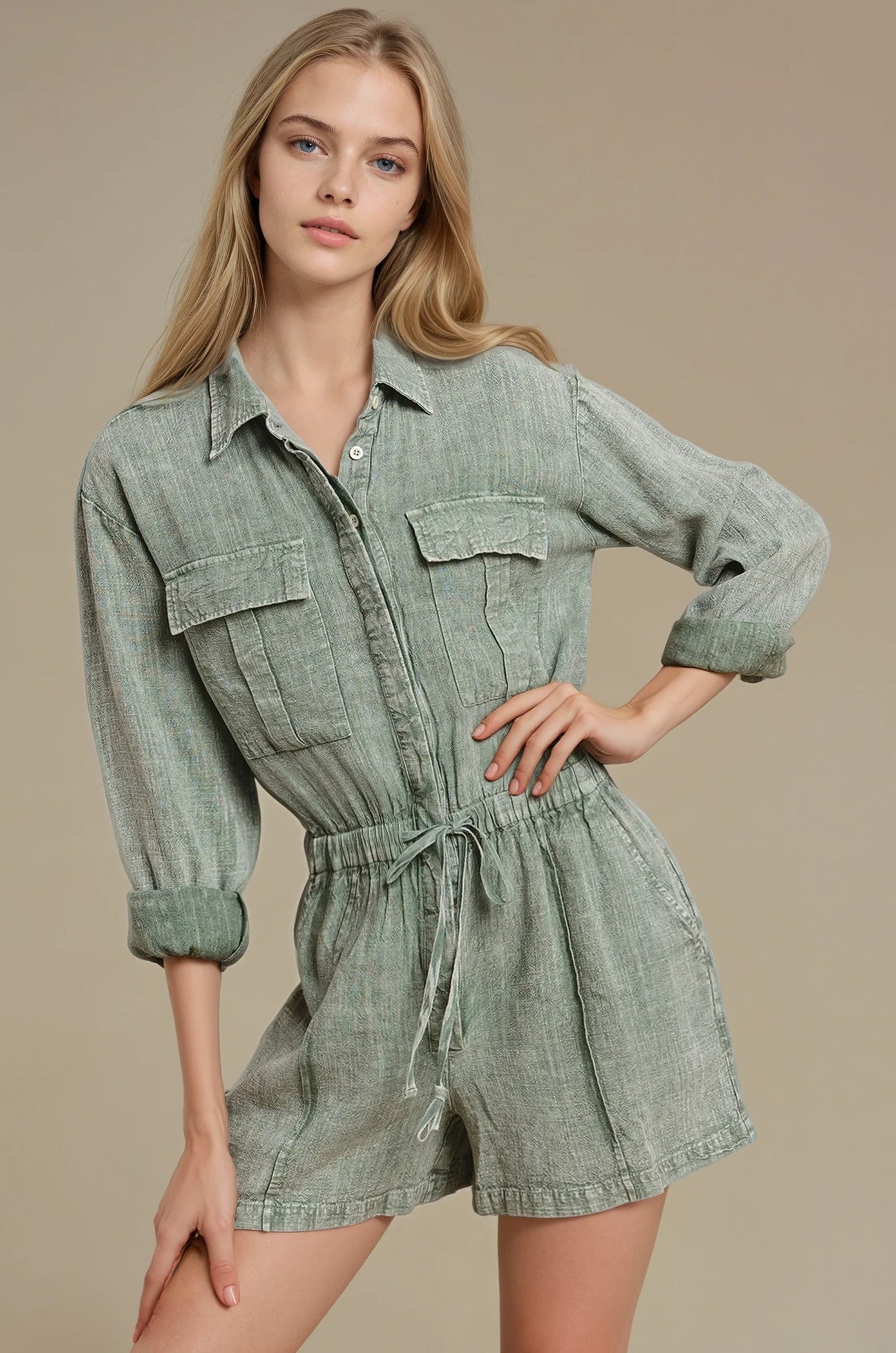 This romper is designed with a button-down closure, crafted from mineral-washed linen, and includes an elastic waist paired with a drawstring for a customizable fit. Ideal for seamless seasonal transitions.