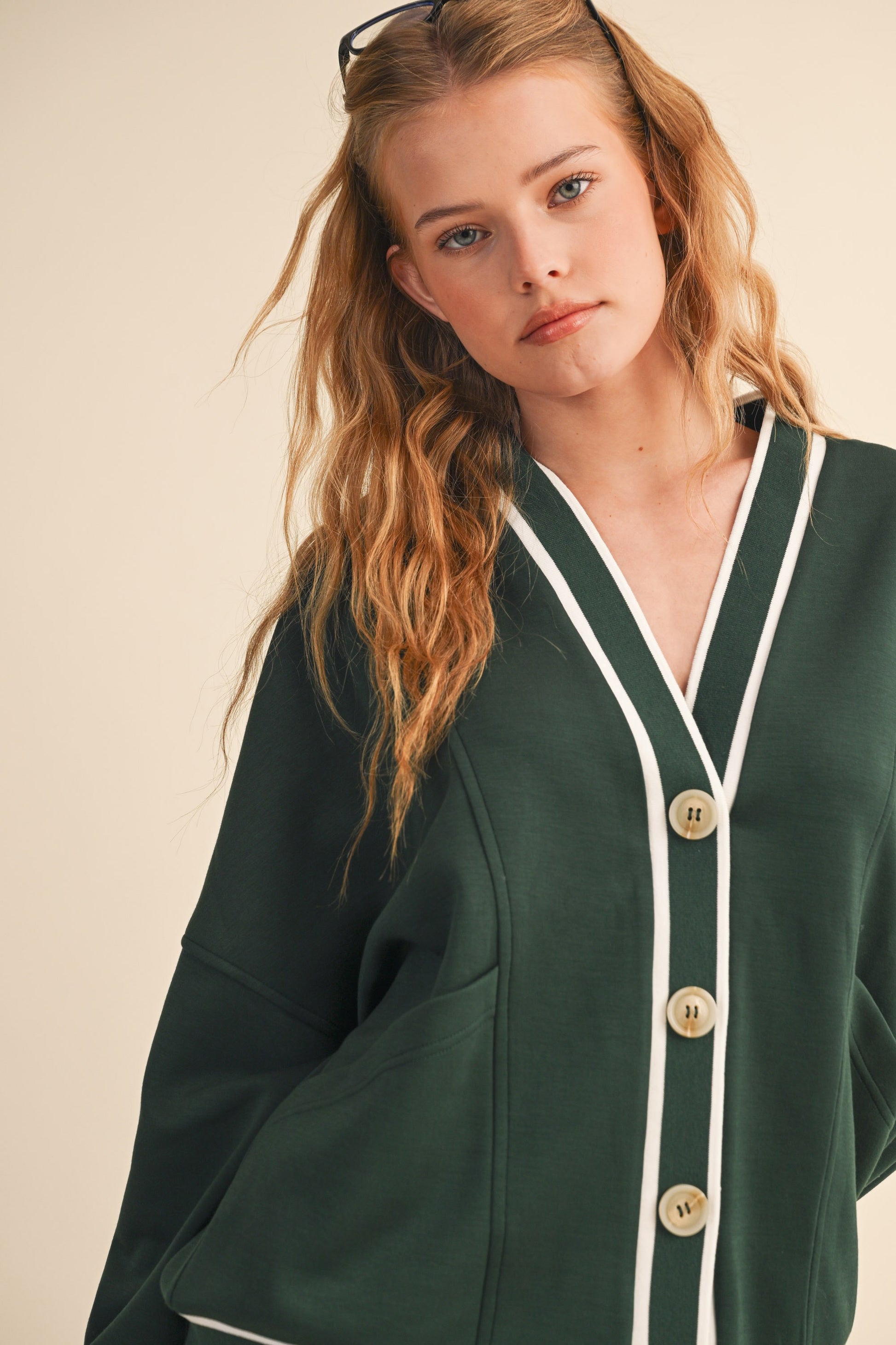V-neckline with contrast trim detailing