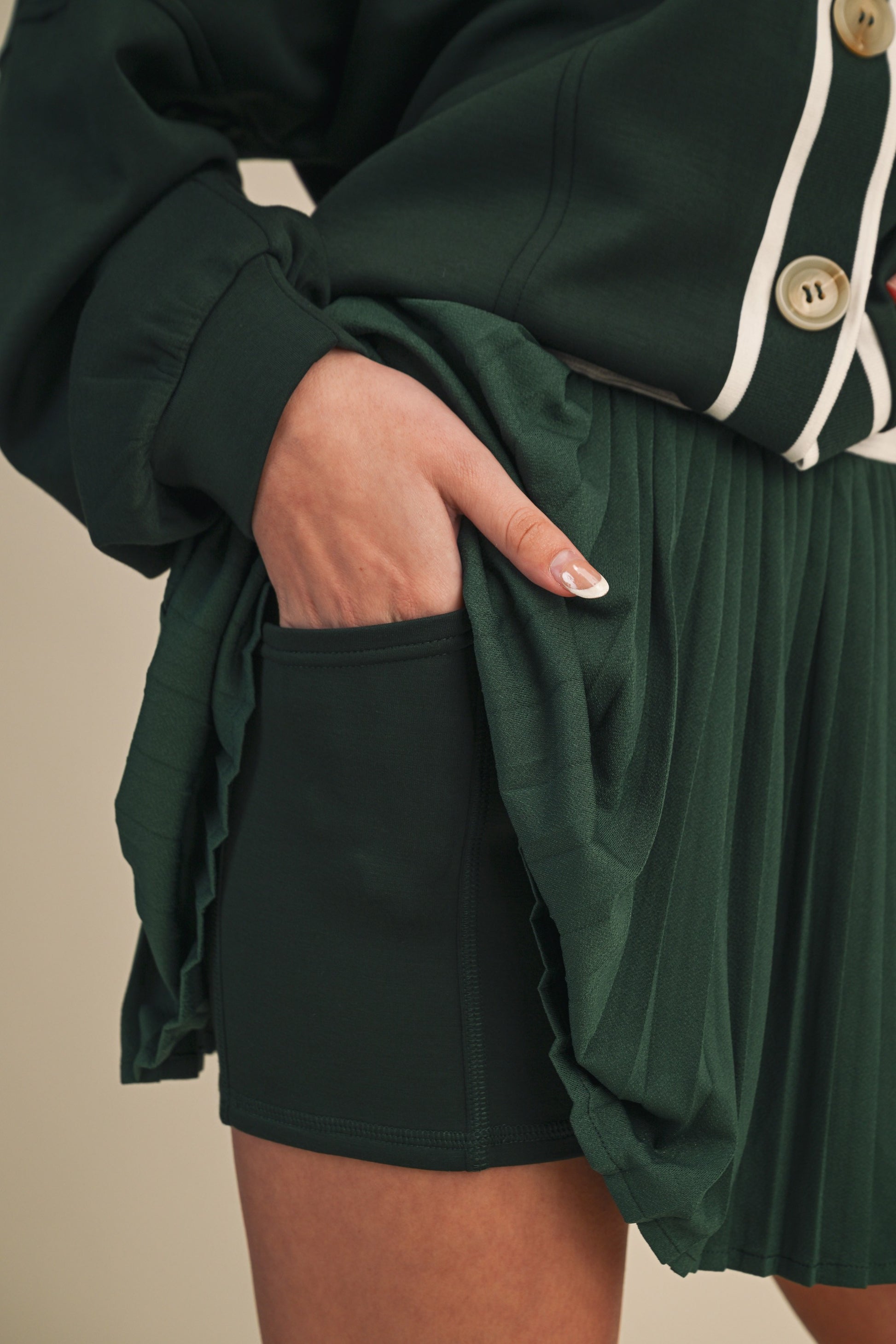 The pleated skort flows beautifully with movement and includes hidden shorts underneath—complete with a functional pocket—making it as wearable as it is chic. Finished in a rich, deep green, this set works just as well worn together as it does styled separately.