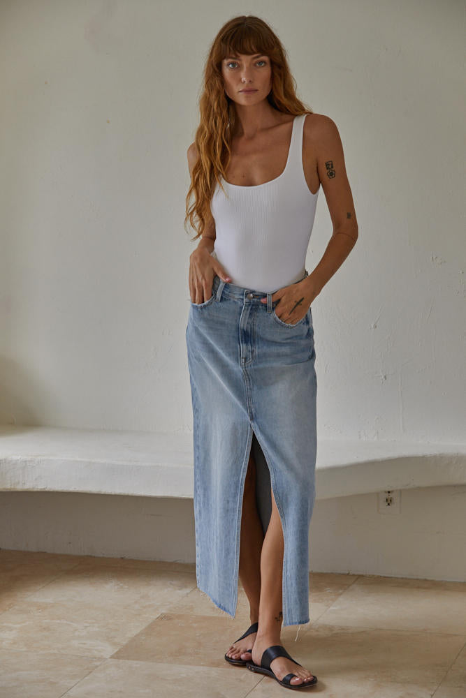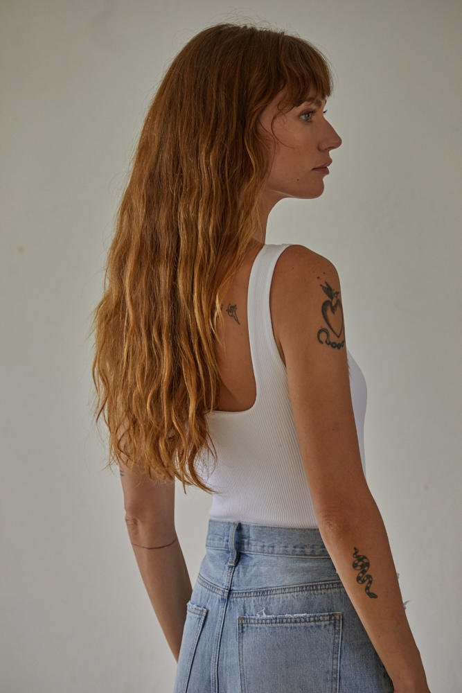 This bodysuit features a seamless, ribbed double-layer design with a square neckline and convenient snap closure at the bottom.