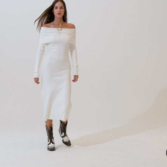 White Flattering midi dress in very stretchy comfortable fine knit. Long sleeves and a foldover bardot neckline give this dress a very feminine touch. Wear it during the colder days of autumn with boots or stilettos.