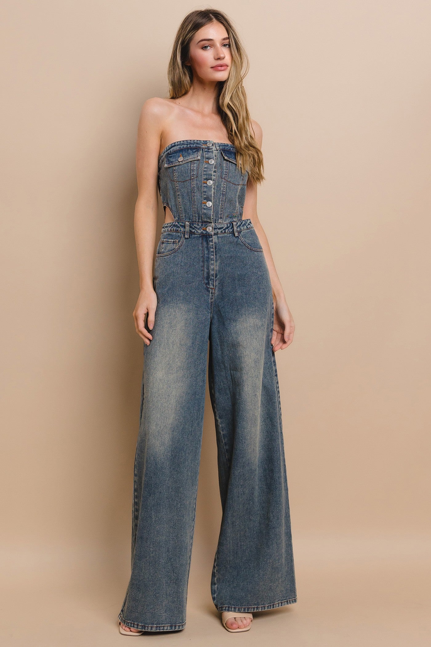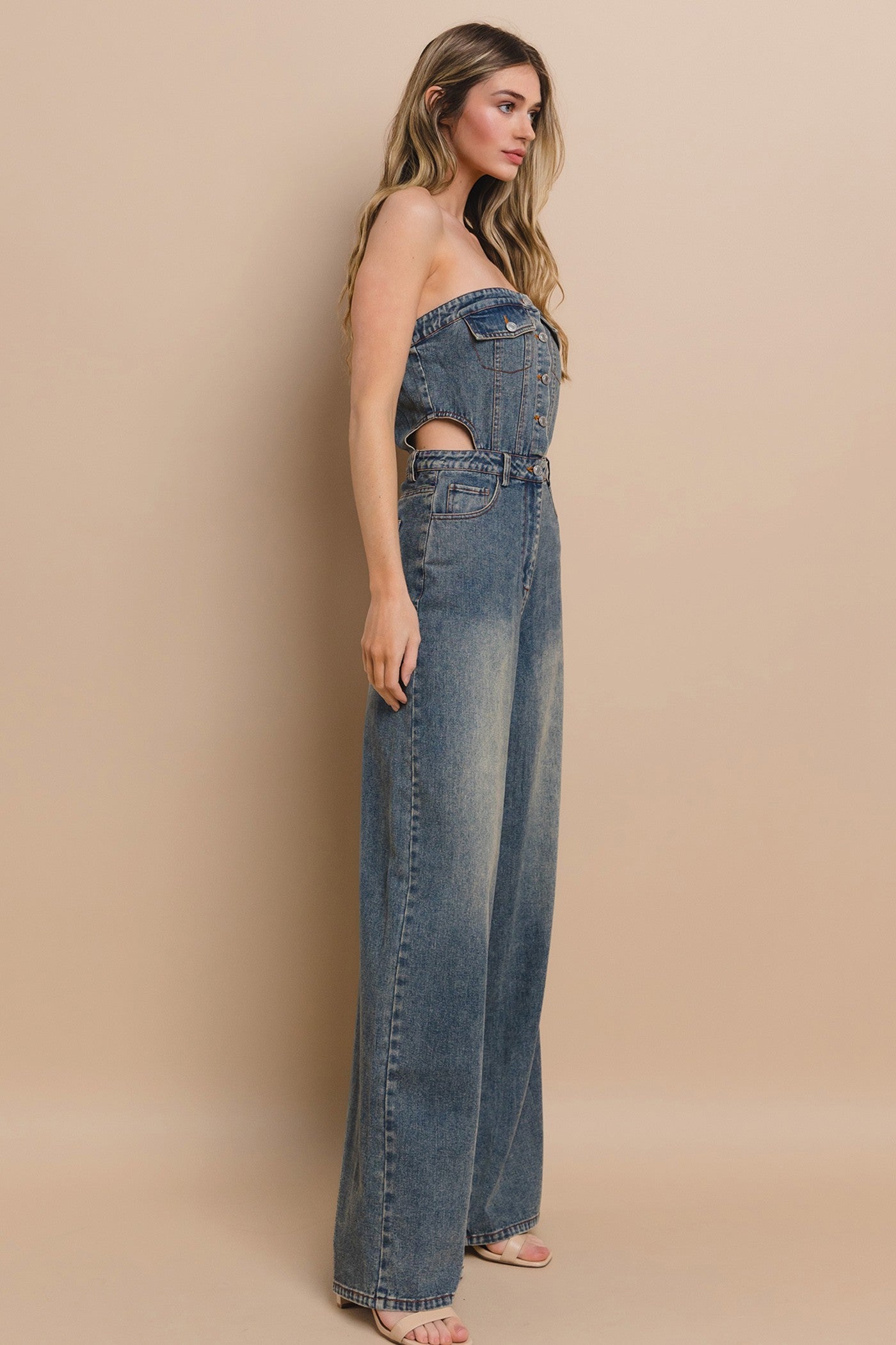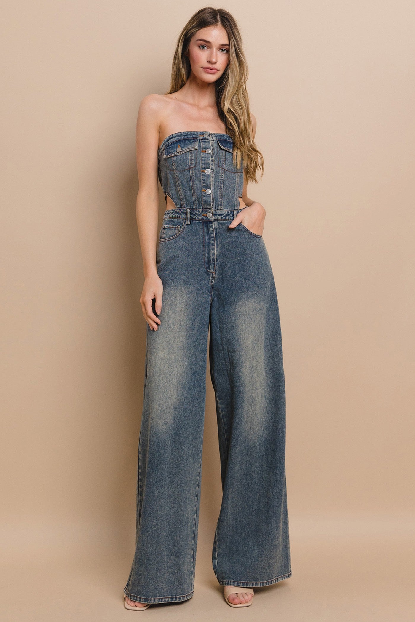 Expertly crafted and versatile, the strapless cut out denim jumpsuit is a must-have for any wardrobe. Featuring a tube top design, button-down closure, and full-length fit, this jumpsuit offers both comfort and style. With a 34" inseam and elastic back detail, it's perfect for any occasion and body type.