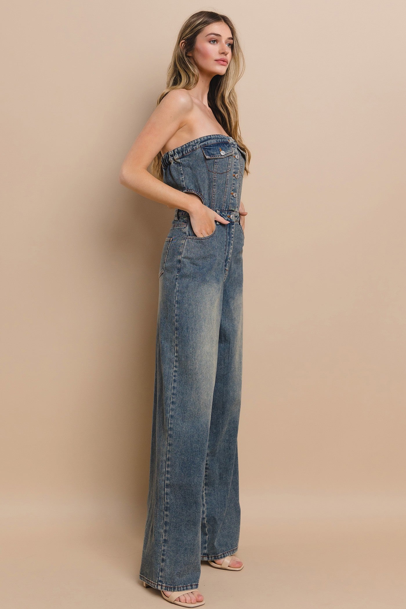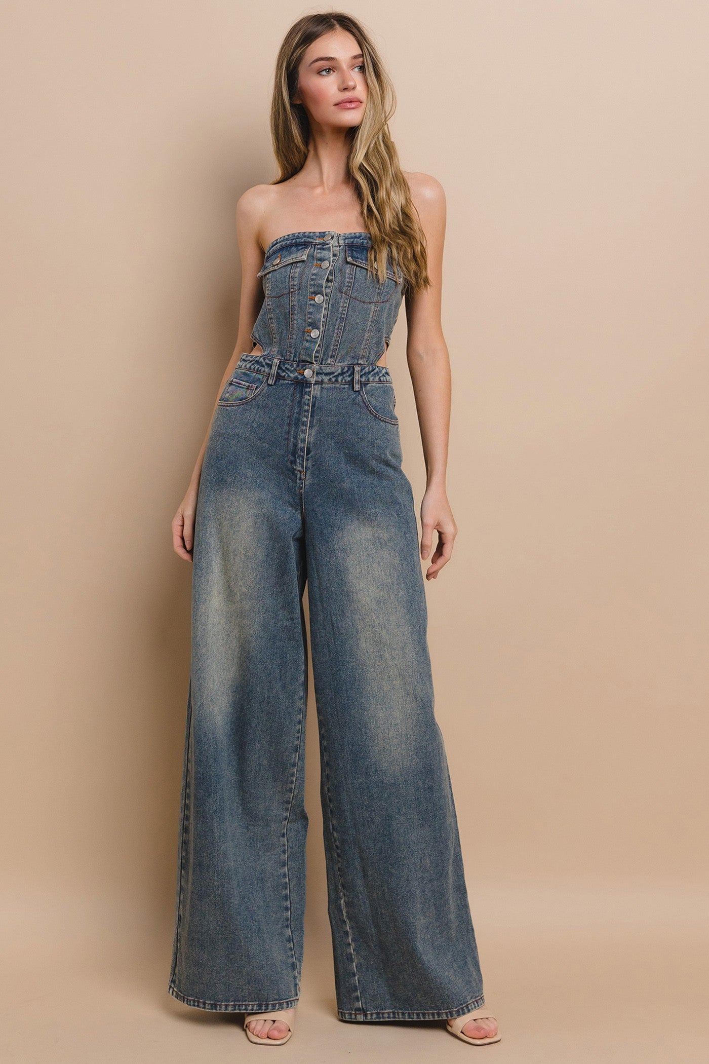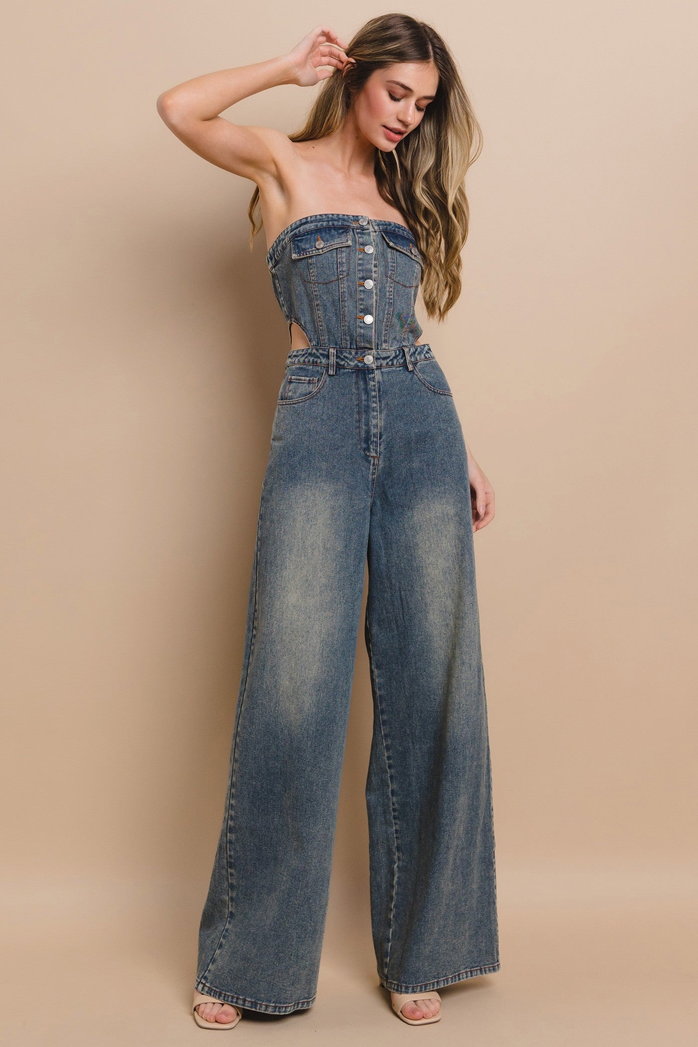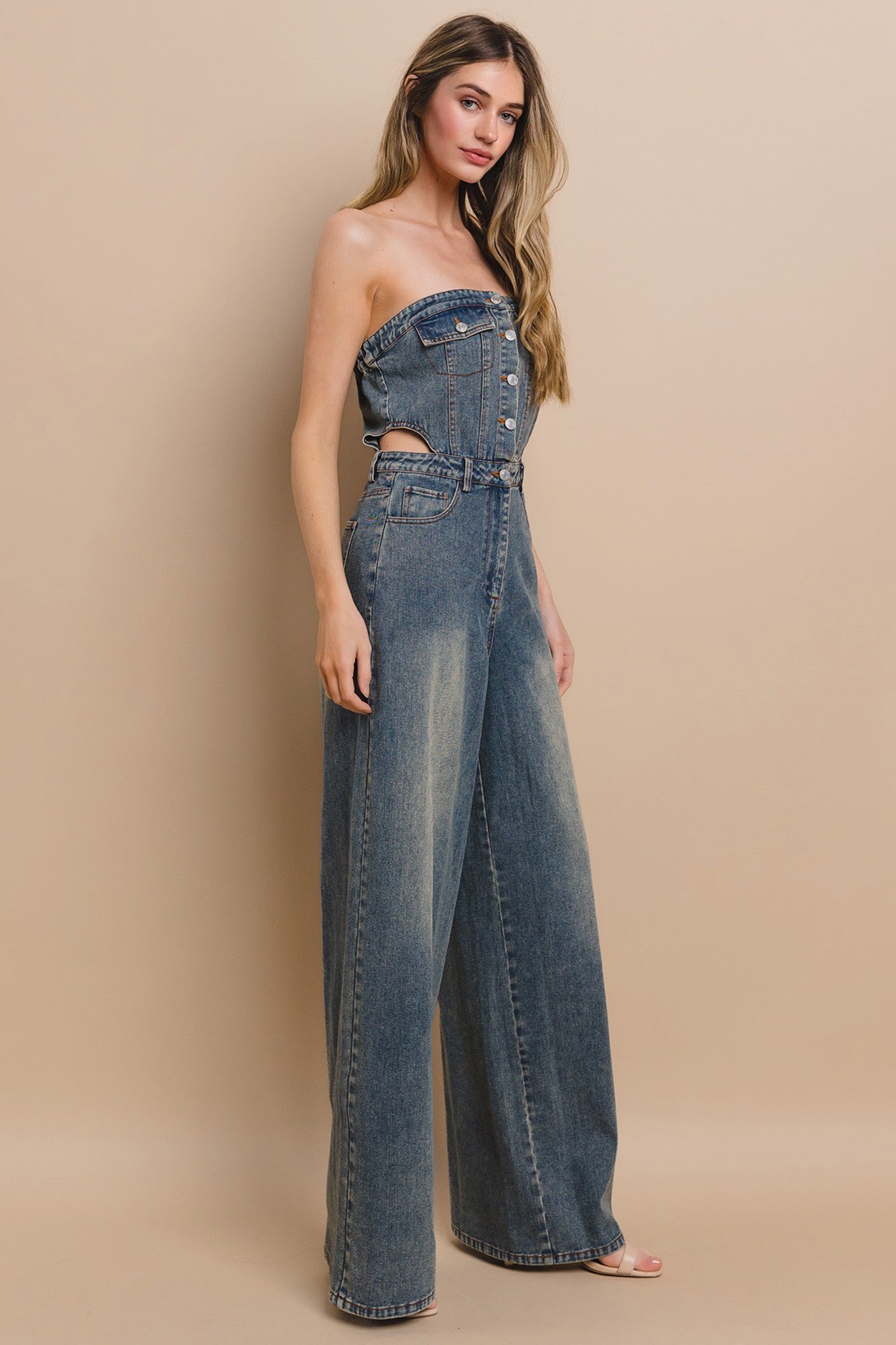 Expertly crafted and versatile, the strapless cut out denim jumpsuit is a must-have for any wardrobe. Featuring a tube top design, button-down closure, and full-length fit, this jumpsuit offers both comfort and style. With a 34" inseam and elastic back detail, it's perfect for any occasion and body type.
